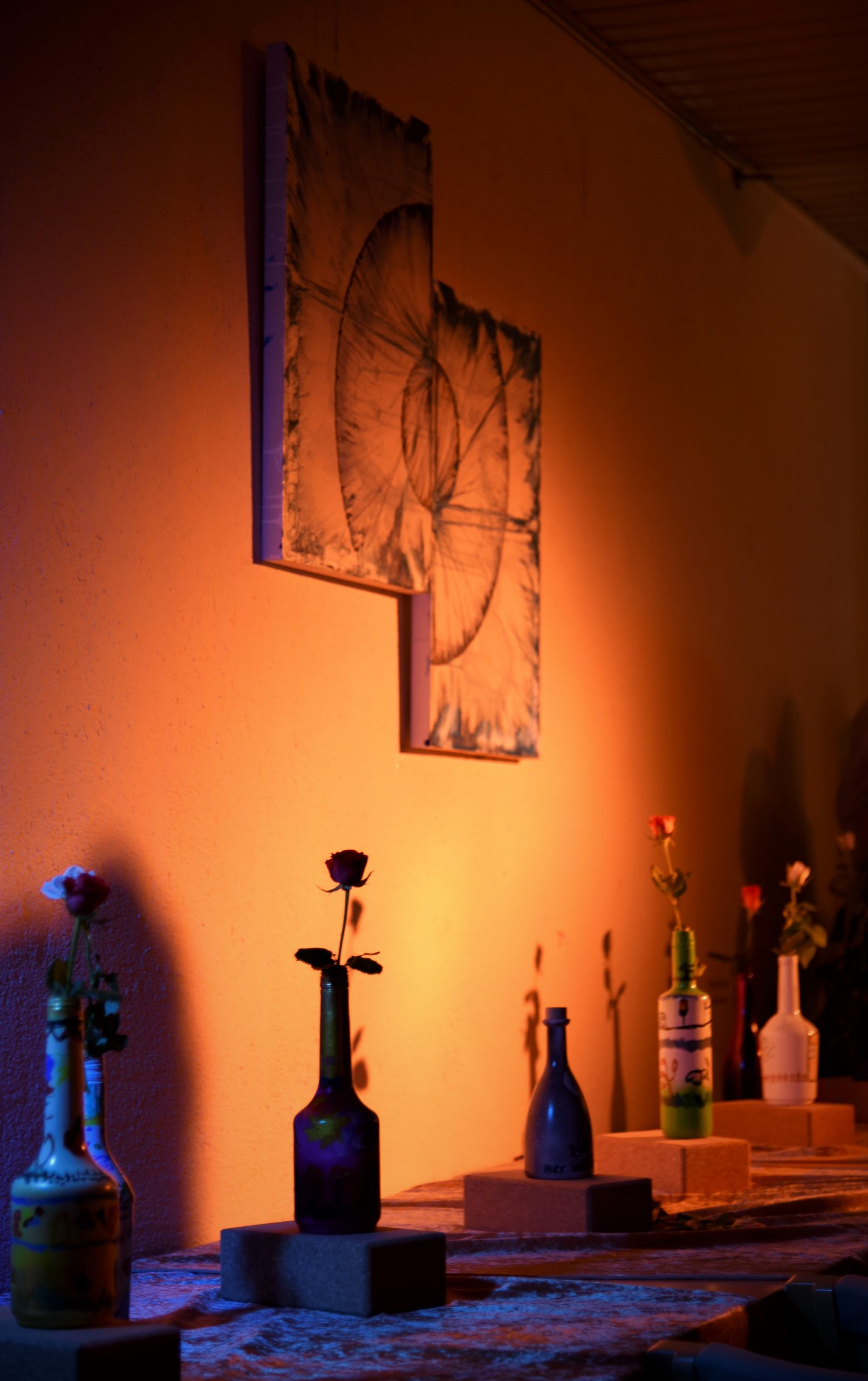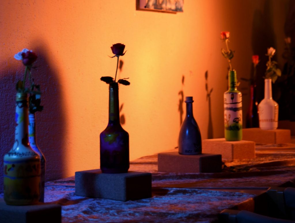 Jeder Teilnehmer gestaltete eine Flasche, die zuerst gesprayt und dann mit Acrylfarben zum Thema „Meine Flucht“ bemalt wurde. Diese individuellen Kunstwerke reflektierten persönliche Schwerpunkte und Assoziationen zur eigenen Fluchtgeschichte. Von der Darstellung der Emanzipation und des Ausbruchs aus den Ketten des Irans bis hin zu Erinnerungen an Liebeskummer, Krieg, Blut, Wasser und Boote – jede Flasche erzählte eine eigene Geschichte. Ein Teilnehmer malte beispielsweise ein Haus mit einem Garten und einer Sonne auf eine komplett weiß gesprayte Flasche, um seine Hoffnung auf eine friedliche Zukunft zu symbolisieren.